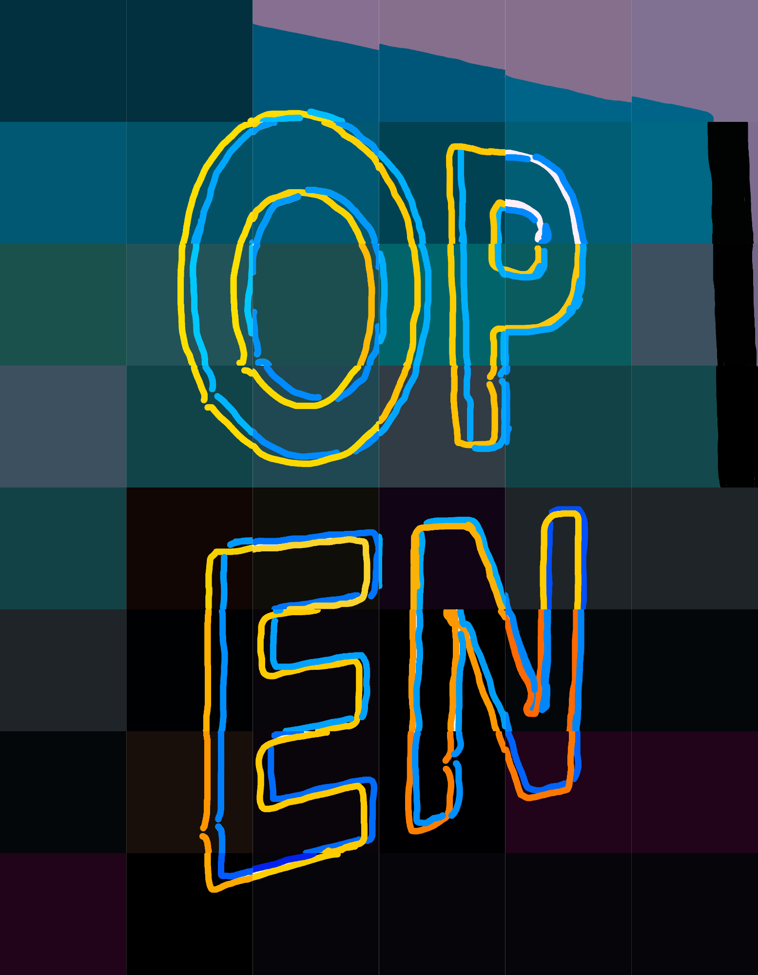 A captivating blend of vibrant neon outlines spell out 'OPEN' against a mosaic of deep hues, invoking an everlasting sense of welcome and opportunity. The fusion of bright yellows and blues conveys both energy and calm, drawing viewers into its imaginative embrace.
