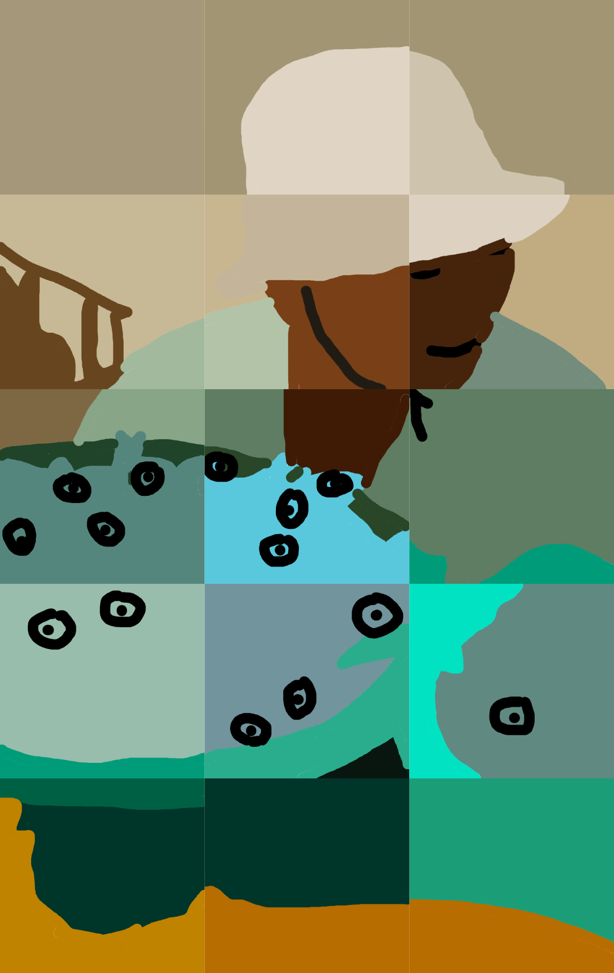 This abstract artwork captures a serene moment of labor and nature. Simplified forms and earthy tones depict a solitary figure tending to their tasks, surrounded by a landscape dotted with abstract shapes, inviting contemplation and connection with the environment.
