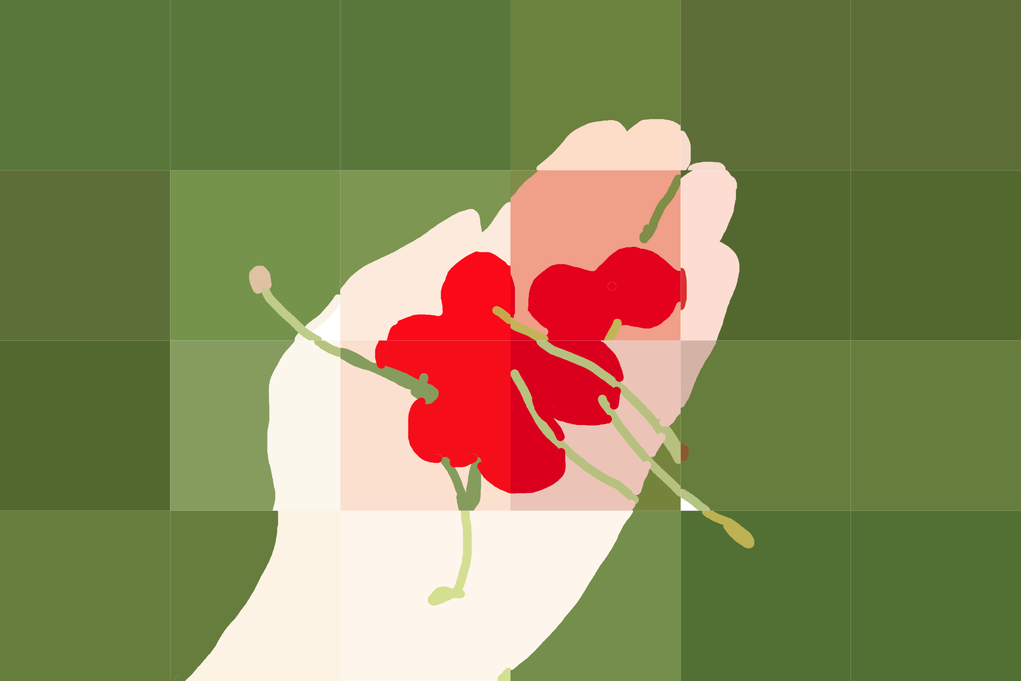 This artwork features a minimalist hand cradling vibrant red flowers against a green checkered backdrop. The juxtaposition of simple geometric shapes highlights the delicate beauty and significance of nature's gifts, evoking a sense of peace and appreciation.