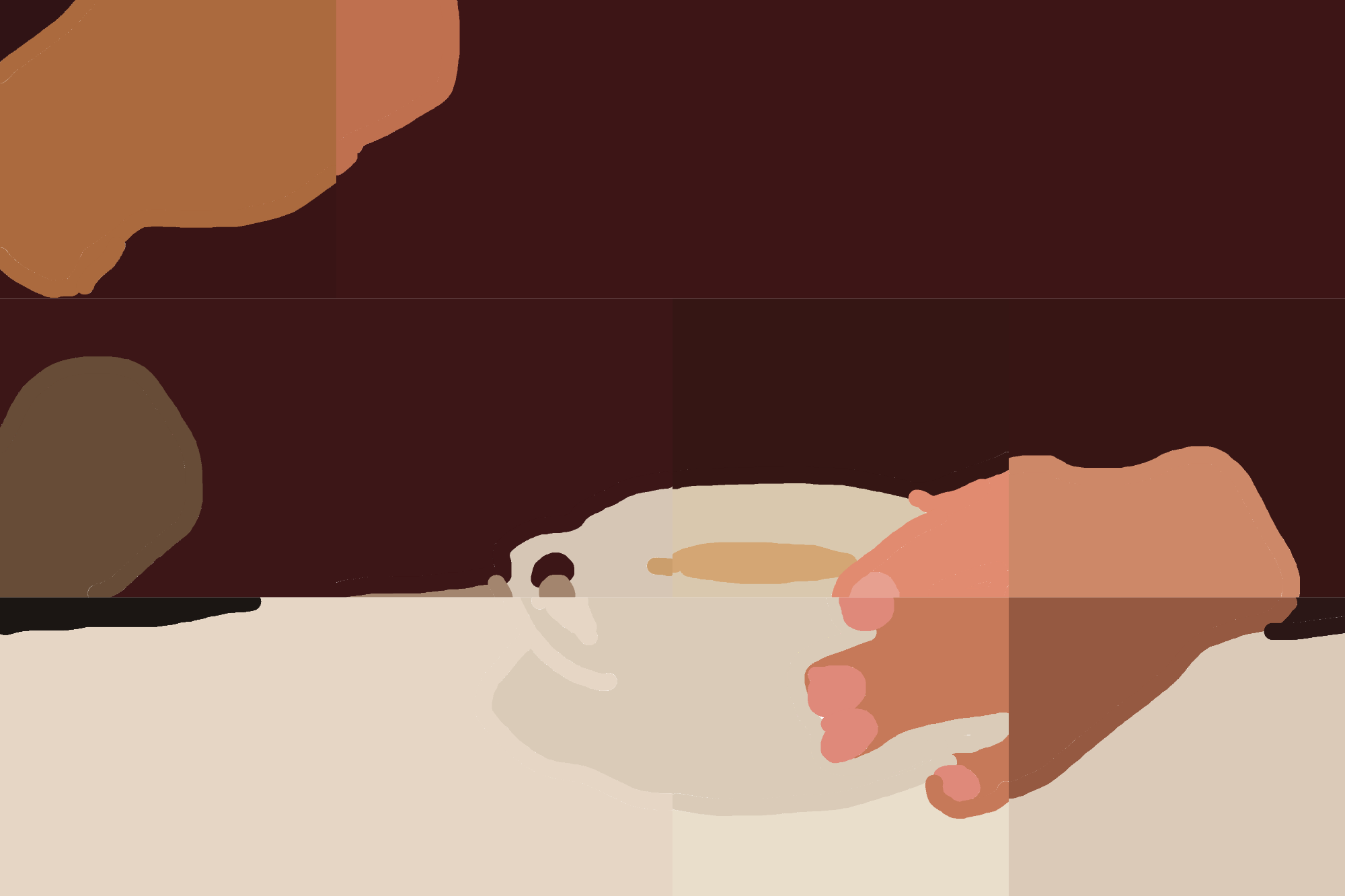 This abstract artwork captures the warmth of a peaceful morning moment. A hand cradling a steaming cup symbolizes comfort and reflection, using soft colors and bold forms to evoke tranquility.