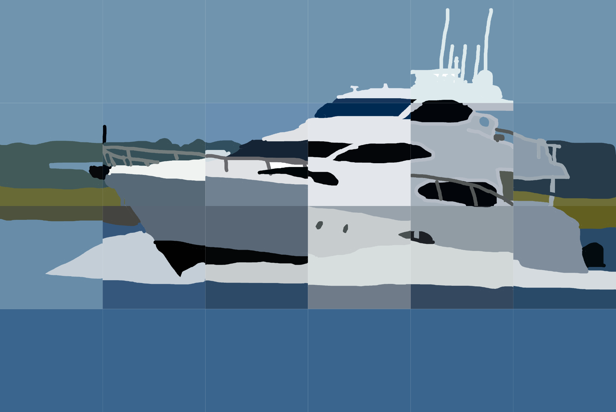This artwork features a yacht depicted through an abstract lens, using bold blocks of color and geometric shapes. The vibrant hues create a serene and dynamic seascape that evokes the freedom of the open water.