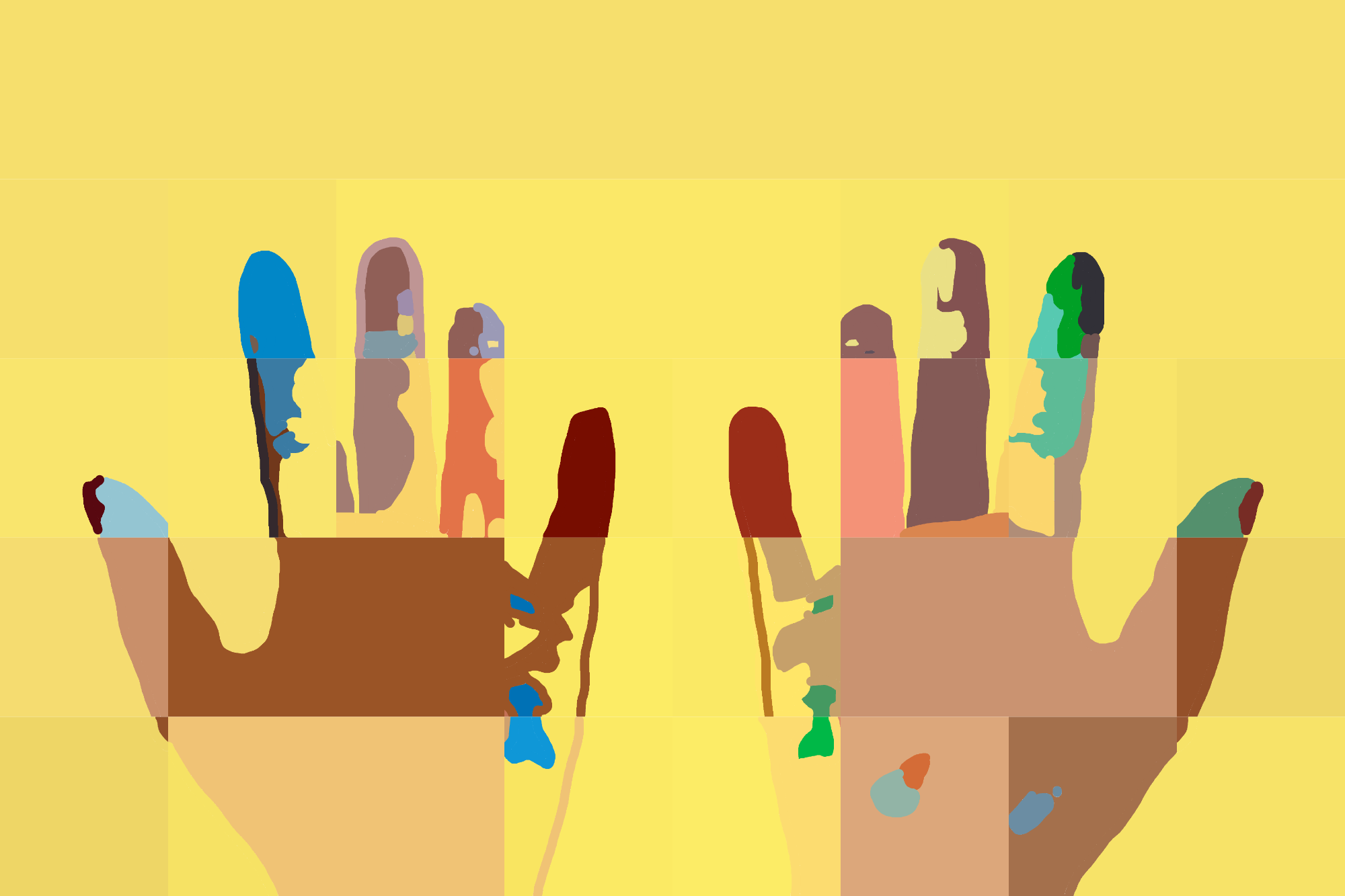 A striking depiction of two hands set against a sunny backdrop. The interplay of colors creates a captivating mosaic effect, symbolizing individuality and unity. This artwork blends abstract and realism to evoke a sense of connection and identity.