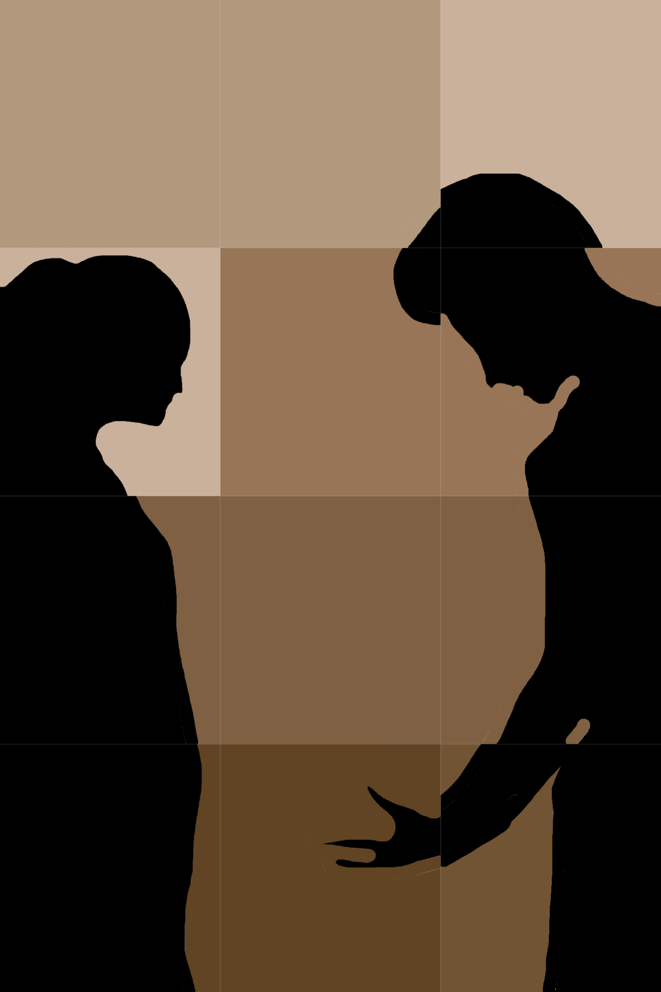 This artwork portrays two silhouetted figures engaged in a silent, poignant interaction. The muted tones emphasize the emotional exchange, creating a powerful visual story of communication and connection.
