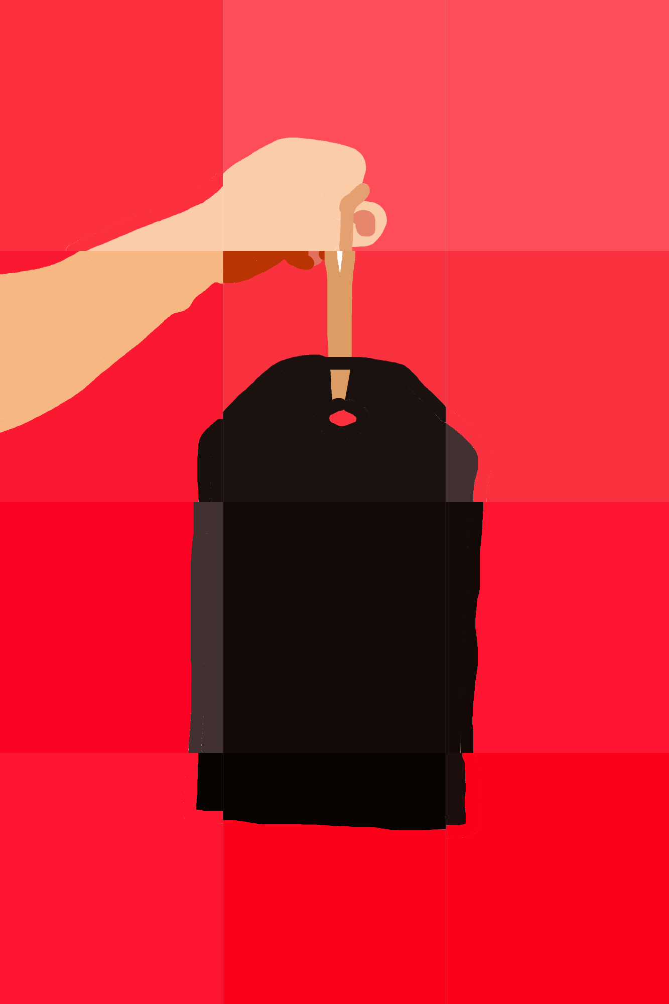 A minimalist portrayal of a hand holding a black garment against a vibrant red backdrop, capturing the essence of simplicity and elegance. The artwork uses bold colors and clean lines to invoke a sense of clarity and focus.